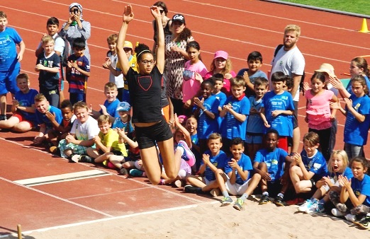 Ebenso wie Marie, landete Rene Stauß (erfolgreicher Zehnkämpfer und Projektleiter von „WLV Kinderleicht-Athletik VOR ORT“) am Montag im Tübinger Hexenkessel, den die Kinder veranstalteten, weite Sätze in den Sand. „Der Wahnsinn ist das, wenn die über 400 Kinder um die Sandgrube sitzen und einen anfeuern und staunen“.